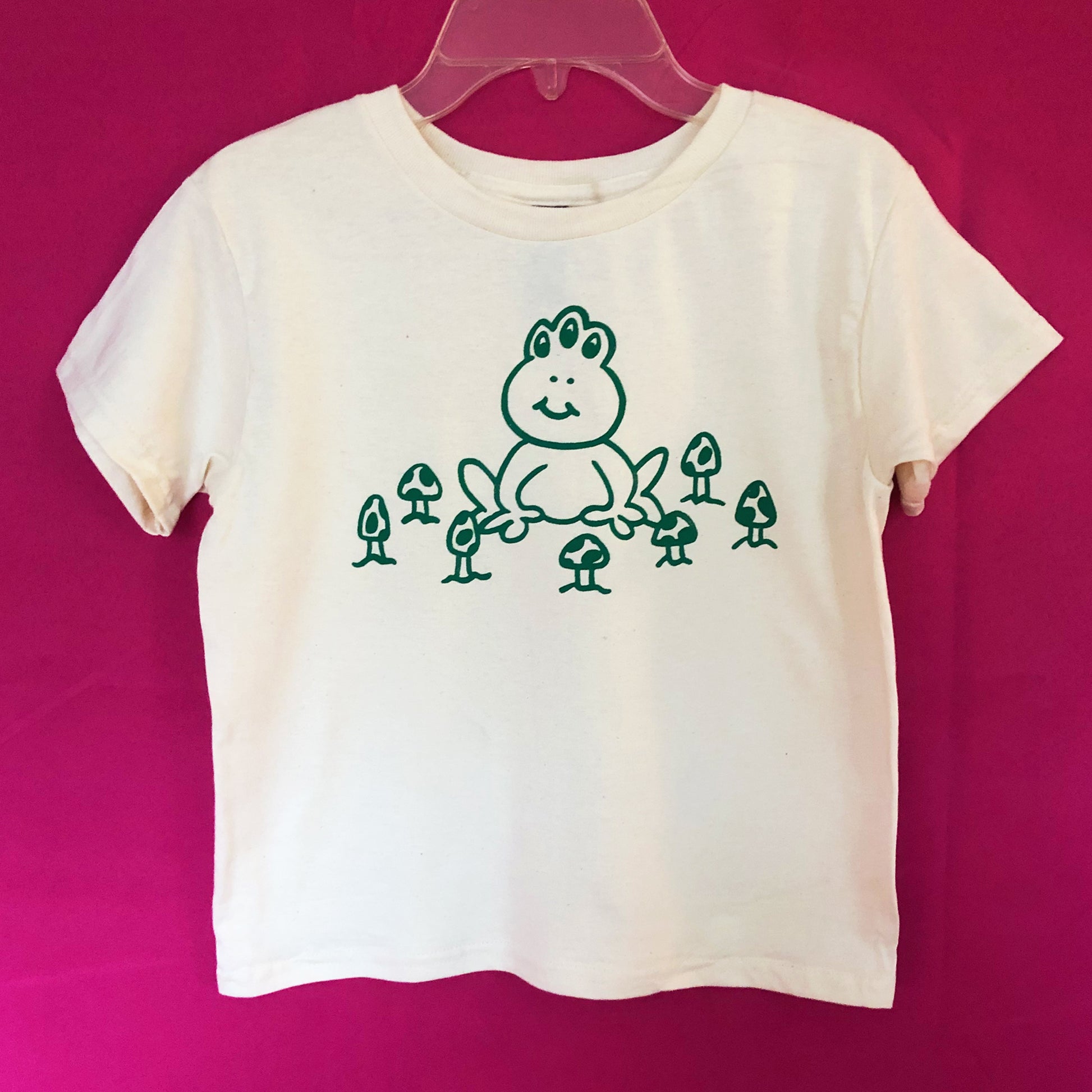 Three eyed frog sitting in a mushroom patch on a hand screen printed youth size t-shirt.