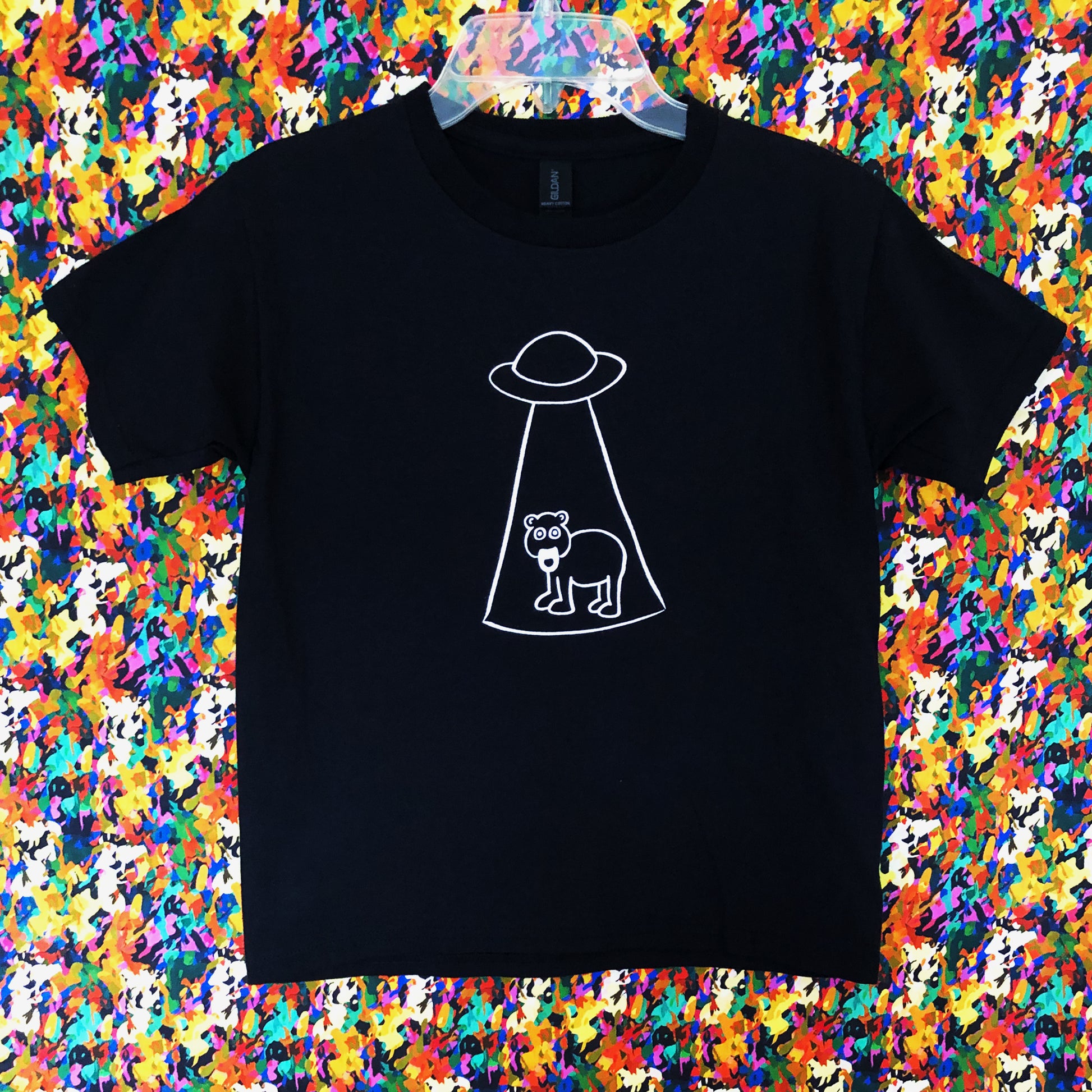 UFO transporting a black bear. Screen printed graphic tee on a youth size shirt.